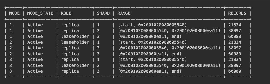 After inserting many more rows we can see the cluster splitting row shards and shuffling them around the cluster!